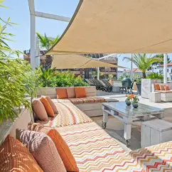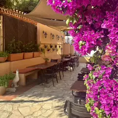 La Casita ligt rondom het zwembad en voelt open en zomers aan. Je zit tussen terracottakleuren, groen en bloeiende bloemen, met schaduwdoeken die zorgen voor verkoeling op warme dagen. De tafels staan verspreid rond het water, waardoor het nooit druk of vol aanvoelt, maar juist ontspannen.